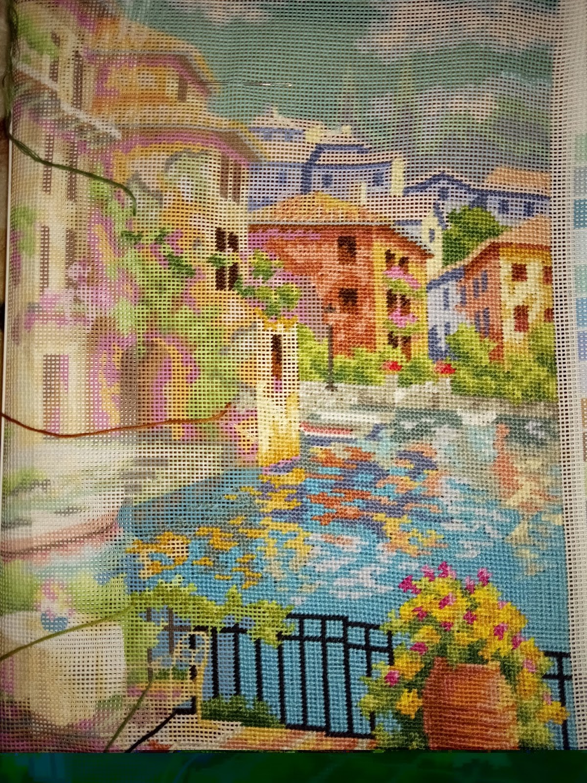 Не так много, но всё-таки продвижение есть. Вышивала урывками, так как при искусственном освещении дырочки на бежевой канве видно плоховато.